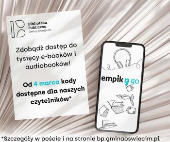 Zapraszamy po odbiór kodów do aplikacji Empik Go. Kody dostępne są stacjonarnie w Bibliotece w Grojcu, dla czytelników, w godzinach funkcjonowania biblioteki.
