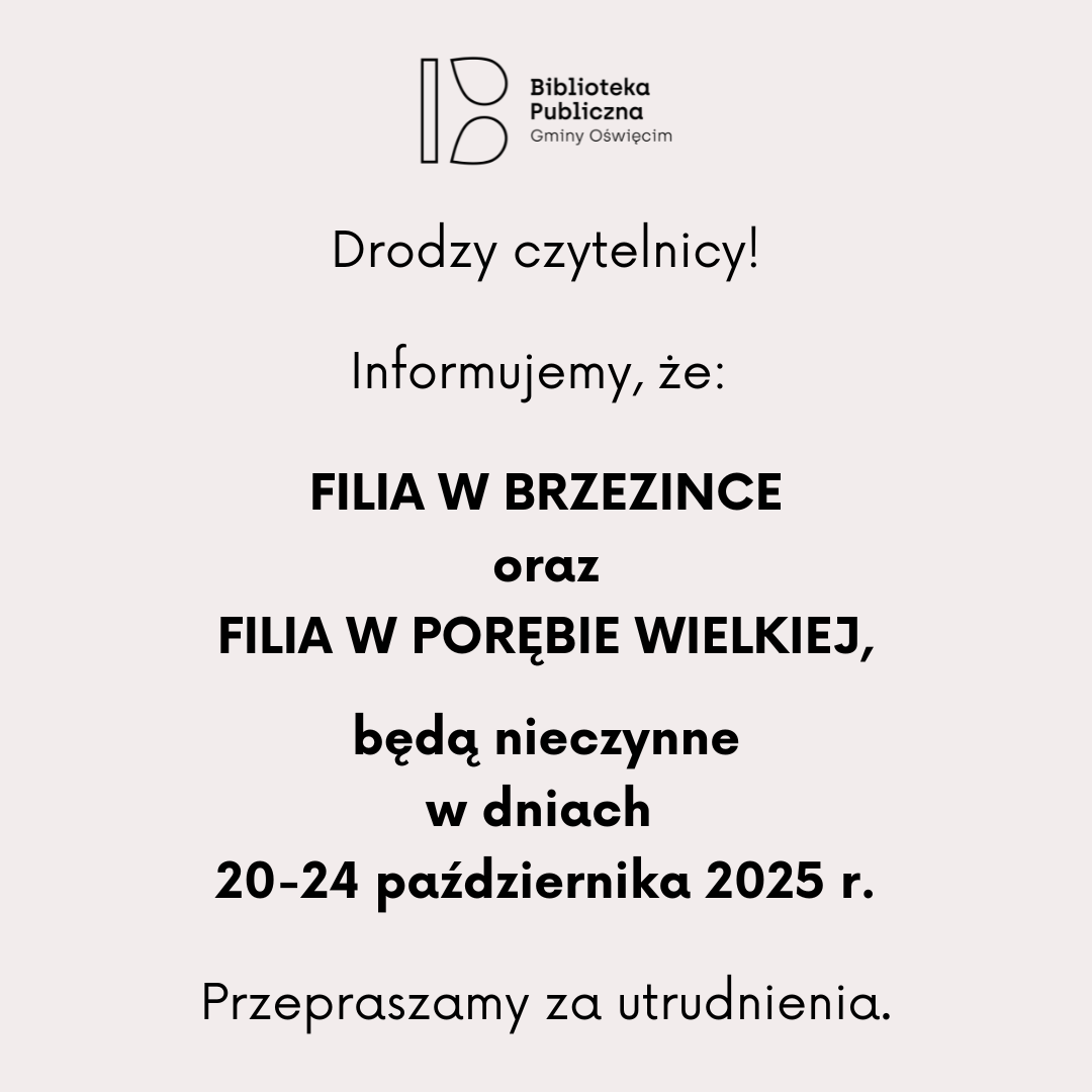 W okresie od 20.10(poniedziałek) do 24.10(piątek) nieczynne będą Filie w Brzezince oraz w Porębie Wielkiej.