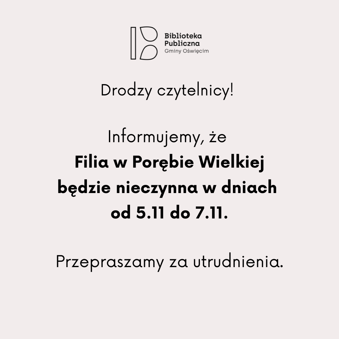 Informujemy, że Filia w Porębie Wielkiej będzie nieczynna w dniach od 5 do 7 listopada.