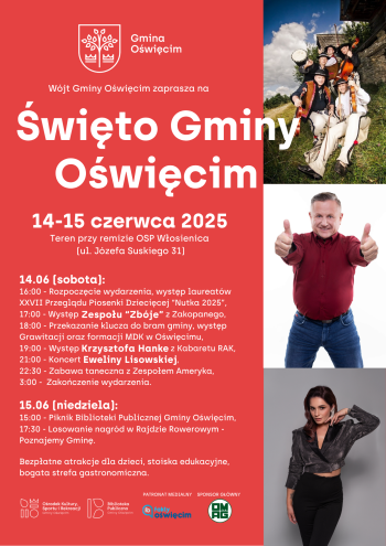 Serdecznie zapraszamy na Święto Gminy Oświęcim, które odbędzie się 14-15 czerwca 2025 r. we Włosienicy.